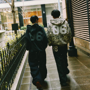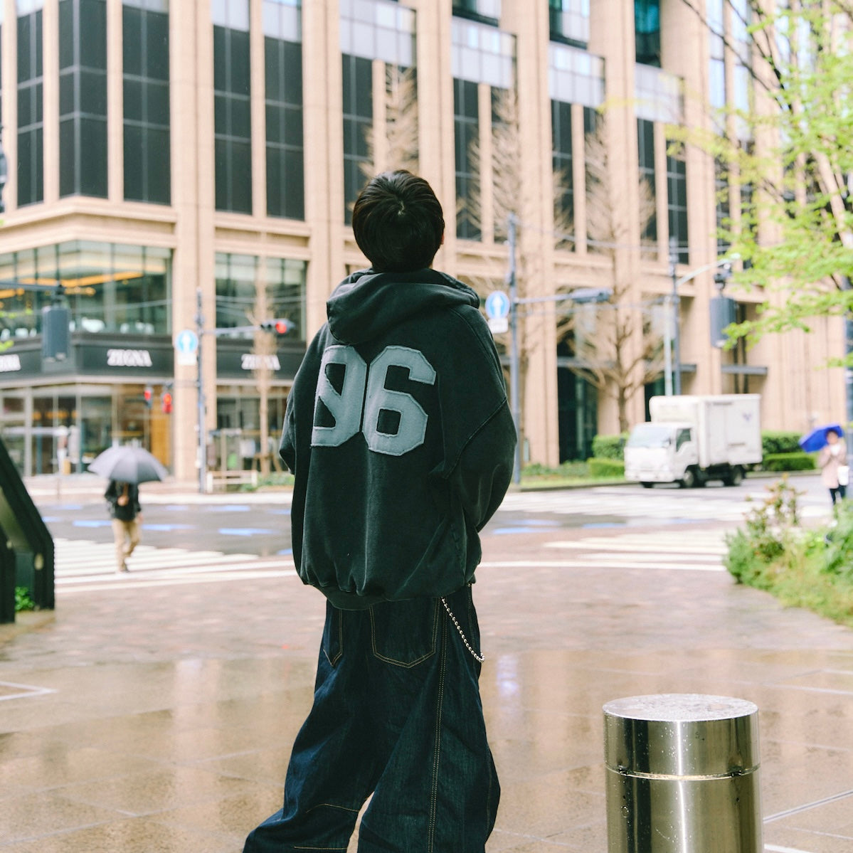 バックに大胆なナンバーロゴをパッチワークにてデザイン。